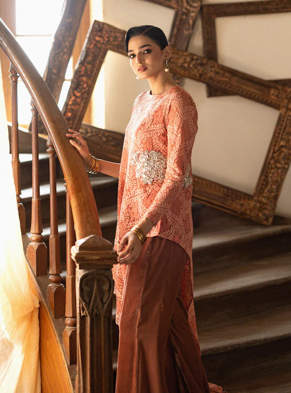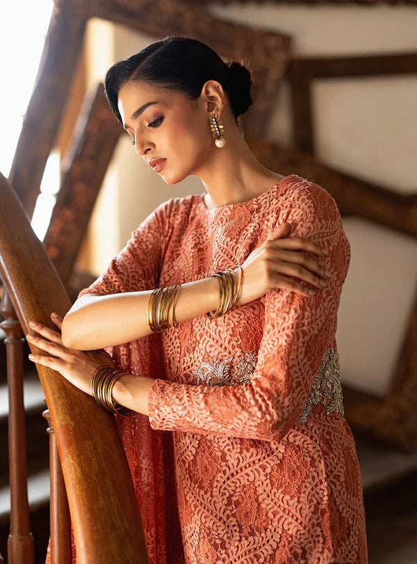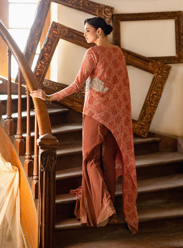 An outfit that makes you feel instantly light, confident, and utterly sophisticated. The top is cut in a fluid, cape silhouette from a delicate Blush-Toned Chantilly Lace which drapes beautifully and gives your movement an ethereal quality. This soft texture is elegantly grounded by a striking silver hand-embellished, placed to define your waist with a precious shimmer. Paired with perfectly tailored flared trousers in a rich, complementary rust tone.