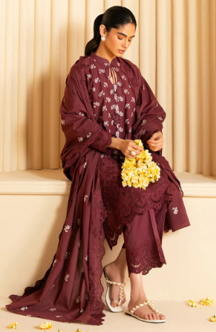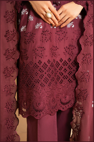 • Elevate your style with our Celestial Berry 3PC Chikankari Suit. The shirt features intricate chikankari embroidery on soft lawn fabric, while the back is dyed for a contrasting look. The cambric chikankari trouser adds a touch of sophistication, and the lawn chikankari dupatta completes the look. Experience luxury and elegance.