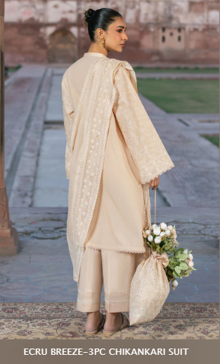 - Achieve a sophisticated and elegant look with our ECRU BREEZE-3PC CHIKANKARI SUIT. The Chikankari Lawn detailing on the front and sleeves adds a touch of delicate beauty, while the dyed back ensures a cohesive and polished appearance. The Cambric dyed trouser provides comfort and style, while the Chiffon Chikankari dupatta completes the look with its flowy and intricate design. Elevate your wardrobe with this stunning and versatile ensemble.