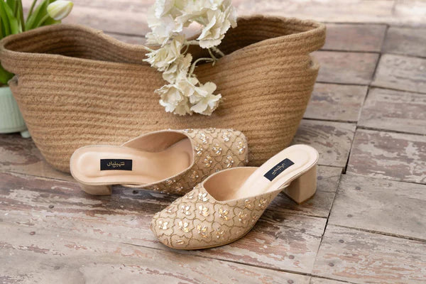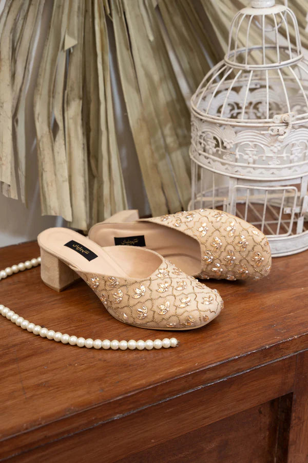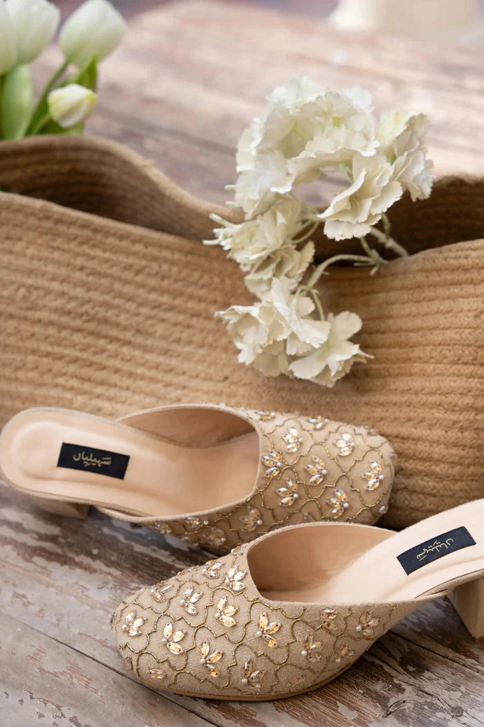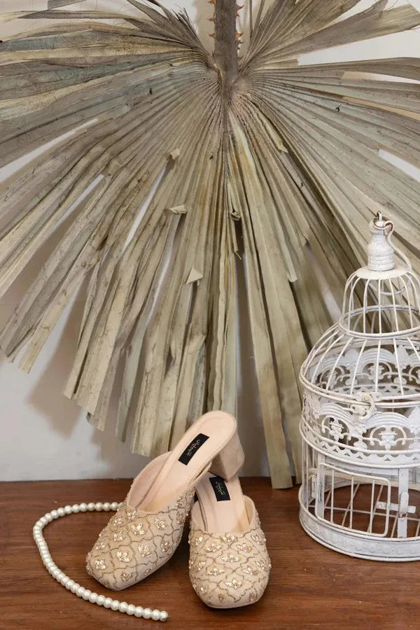Eloria is a soft, graceful statement of timeless style. These nude-toned block heels are beautifully detailed with hand-embellished floral motifs, crafted from shimmering gold sequins and delicate beads. The base features a plush, suede-like finish that enhances its luxurious feel and refined appearance.