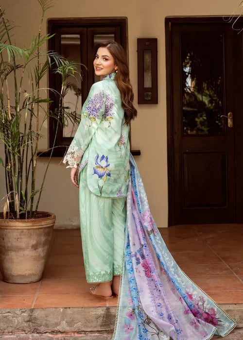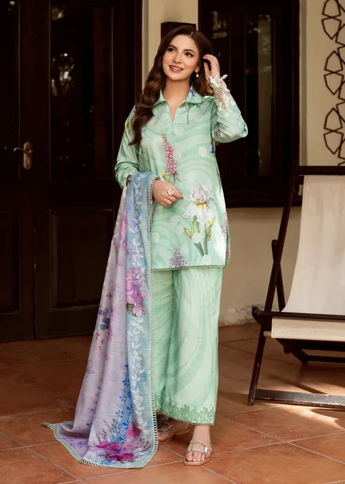 -Digital printed dupatta on manaar 2.5Mtr. -Digital printed shirt on lawn 3 Mtr. -Embroidered border for sleeves on organza -Digital printed trouser on cotton 2.5 Mtr.