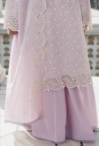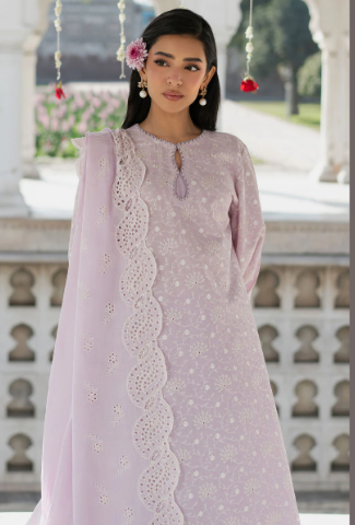 - Expertly crafted with delicate Chikankari detailing, this 3-piece suit exudes timeless elegance. The shirt features intricate embroidery on the front and sleeves, while the back is dyed for a polished finish. The cambric trouser and lawn dupatta complete the look, making it a versatile addition to your wardrobe.