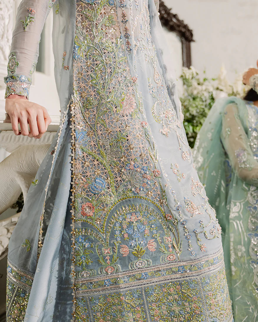 • Embroidered, sequinned pearl embellished front left panel (organza)