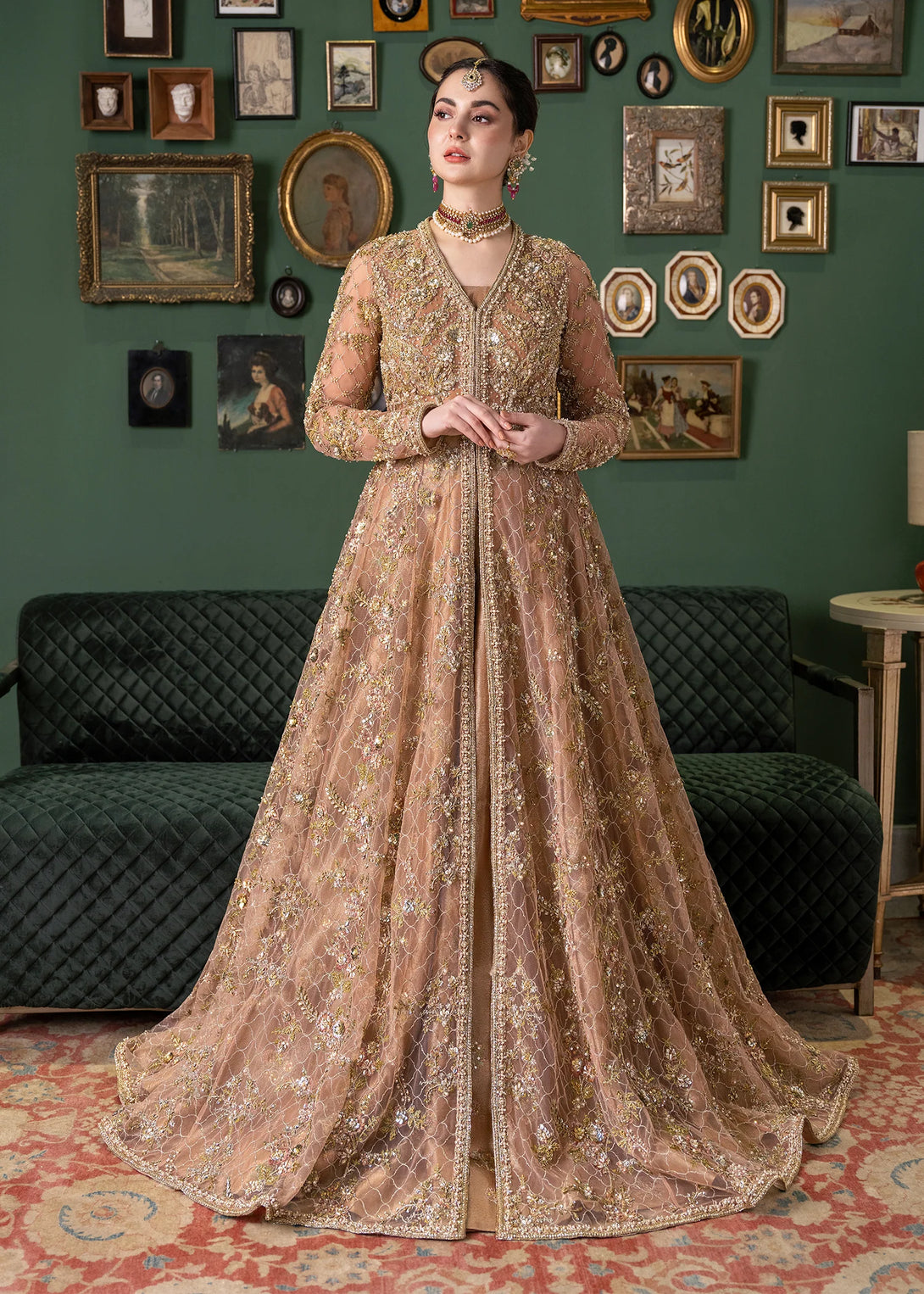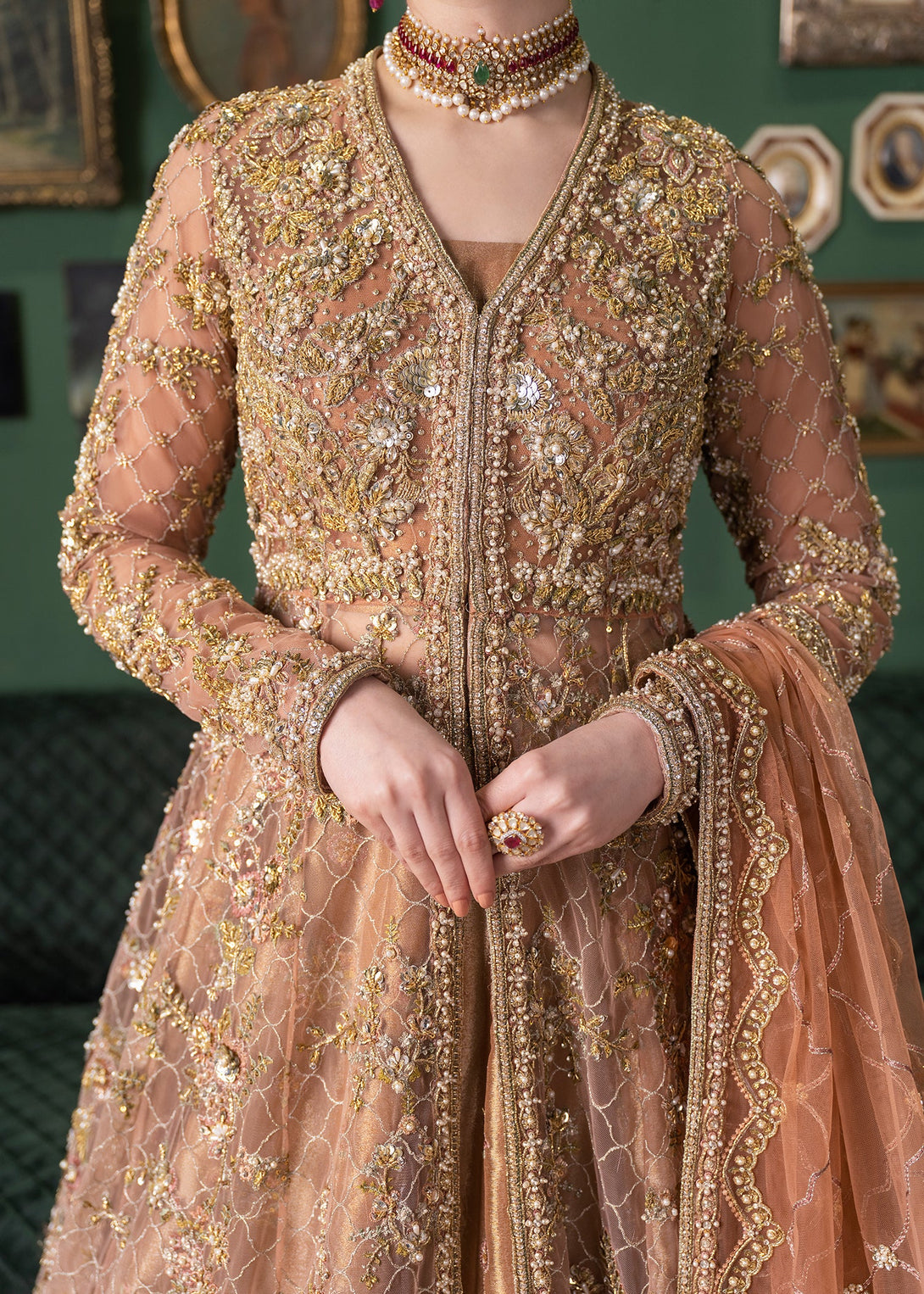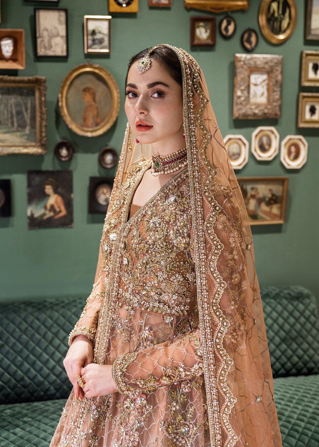 Apricot net heavy peshwas with an embroidered tissue floral lehnga and a net embellished bridal dupatta with thick Resham and ada work at the palus.