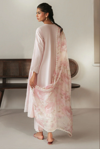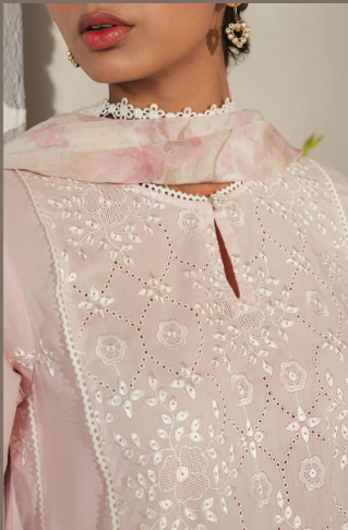 • This Lilac Rose 3PC Chikankari Suit features a delicately embroidered lawn front and sleeves, paired with a dyed back for a refined contrast. The cambric dyed trouser ensures comfort and durability, while the chiffon printed dupatta adds a graceful, flowing finish. Perfectly balanced for elegance and ease, this ensemble showcases expert craftsmanship in traditional Chikankari work.