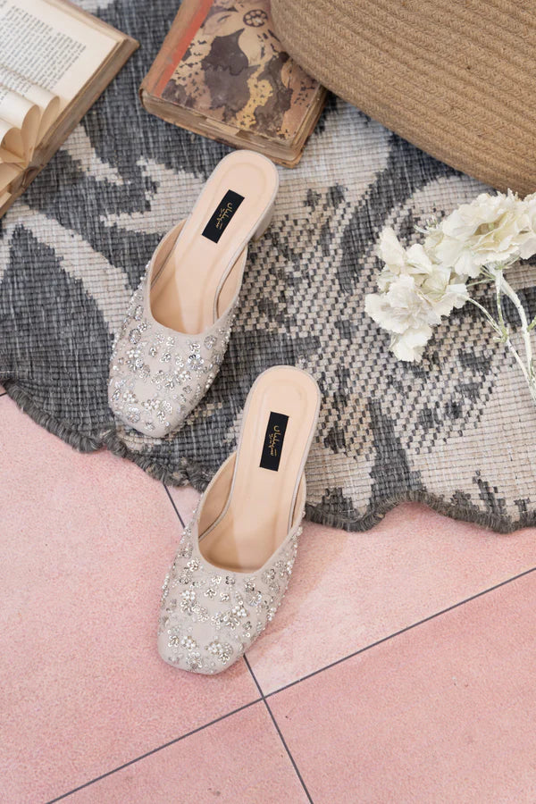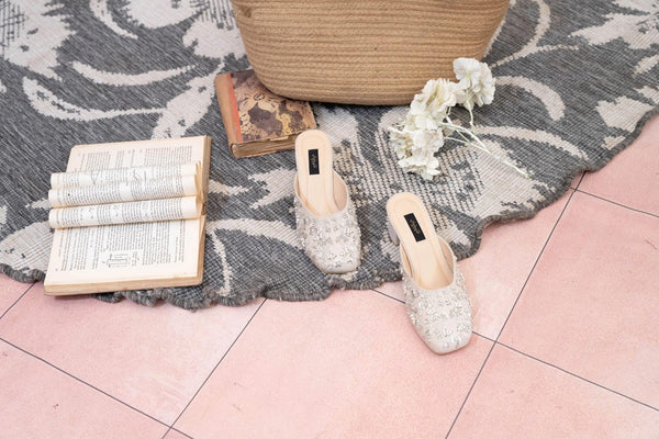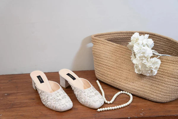 Noire is all about soft glamour and timeless style. These creamy white block heels are covered in delicate hand-embellished crystals and beads, forming a floral pattern that catches the light beautifully. The base has a soft suede-like texture, giving it a clean and polished look.