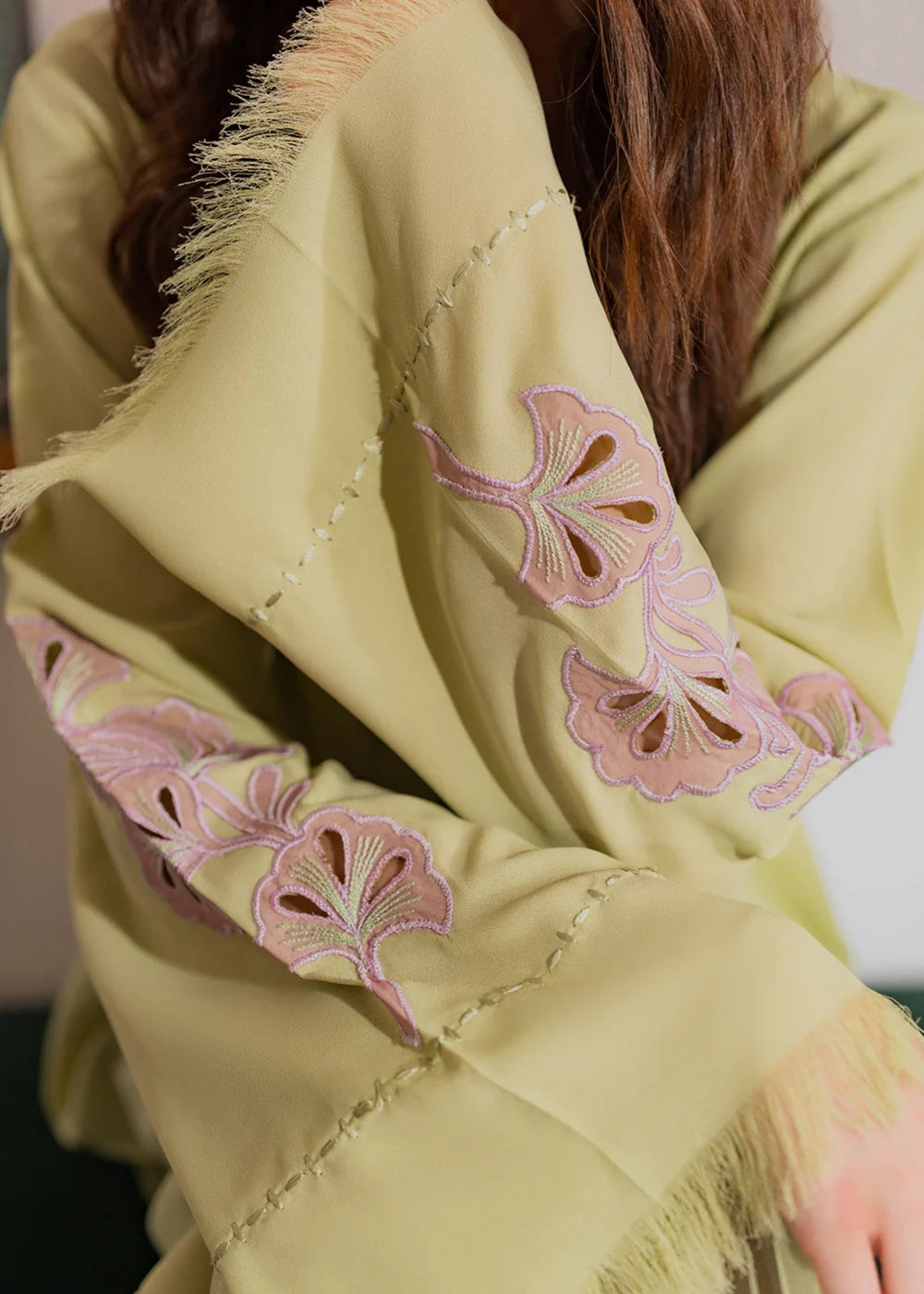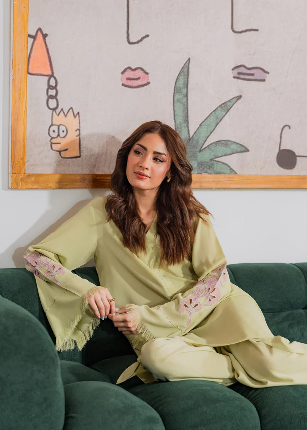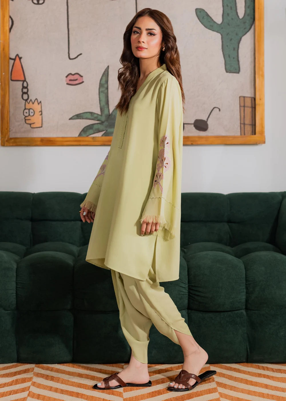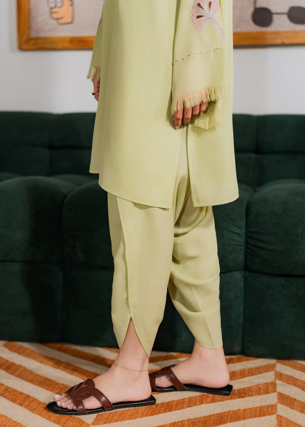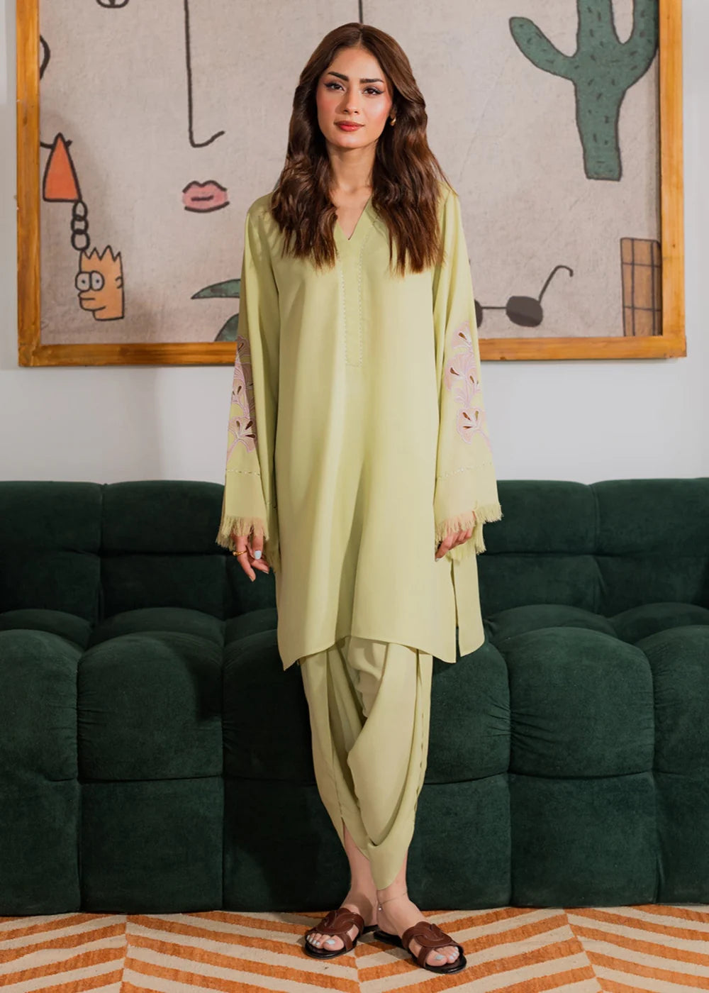 This unique 2-piece women's outfit is crafted from tropical georgette fabric, offering a comfortable and stylish drape. The soft pistachio green top features a relaxed fit with a V-neckline. Its sleeves are accented with a lovely pink embroidered motif, adding a delicate contrast, and finished with subtle fringed detailing at the cuffs. The ensemble is paired with contemporary pistachio green tulip shalwar , which provide a modern twist to the overall silhouette. Ideal for daily wear or casual gatherings, this outfit combines ease with elegant details and a fresh color palette. Fabric: Chinese Imported Tropical Georgette Color Type: Pistachio Green Bottom Style: Tulip Shalwar Number of Pieces: 2 Piece – Top & Bottom Proudly Hand Embroidered and Hand Sewed by Local Craftsmen In Pakistan. Disclaimer: Please note that the color of the item you receive may vary slightly from what is shown due to screen differences. - Due to light color tone of the fabric, slip is recommended.