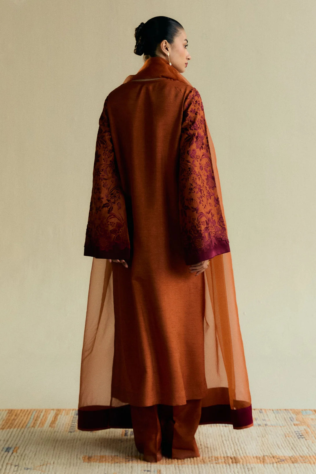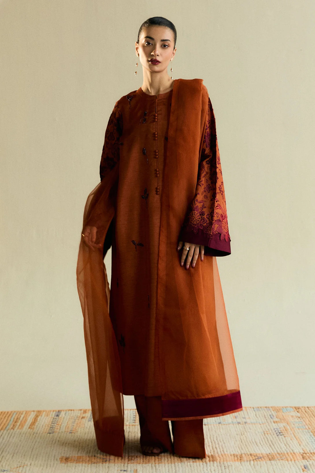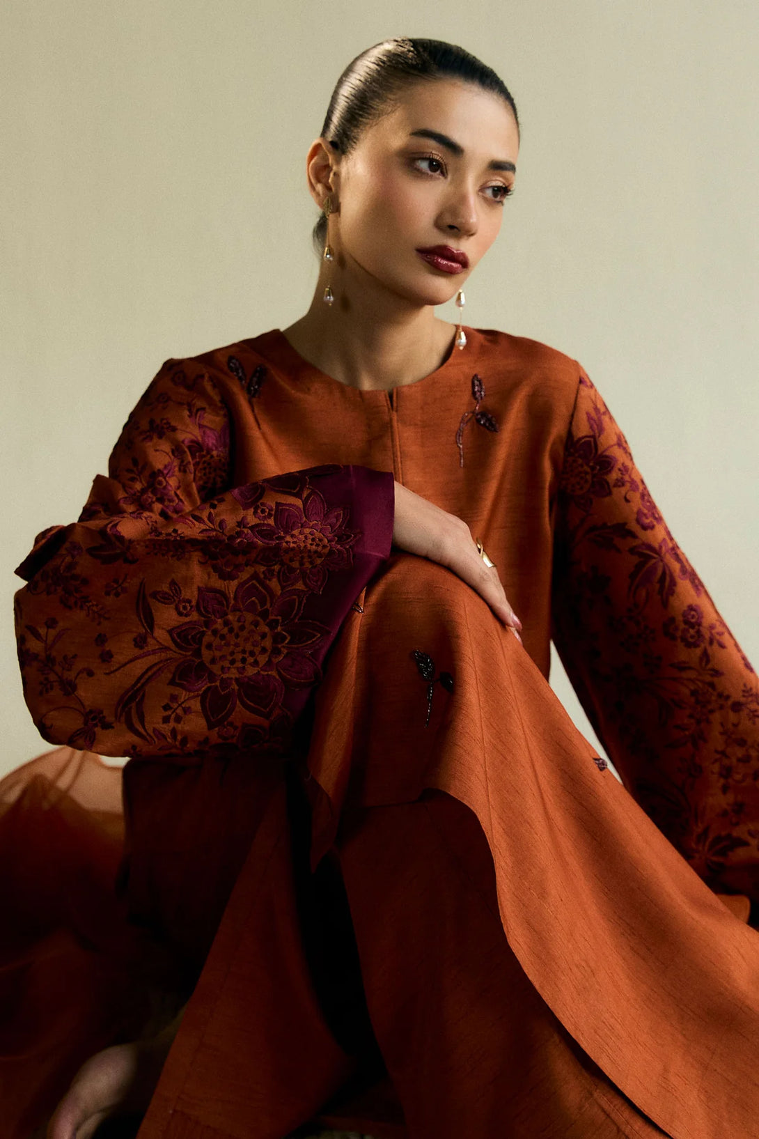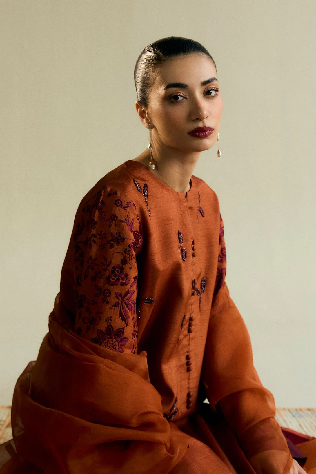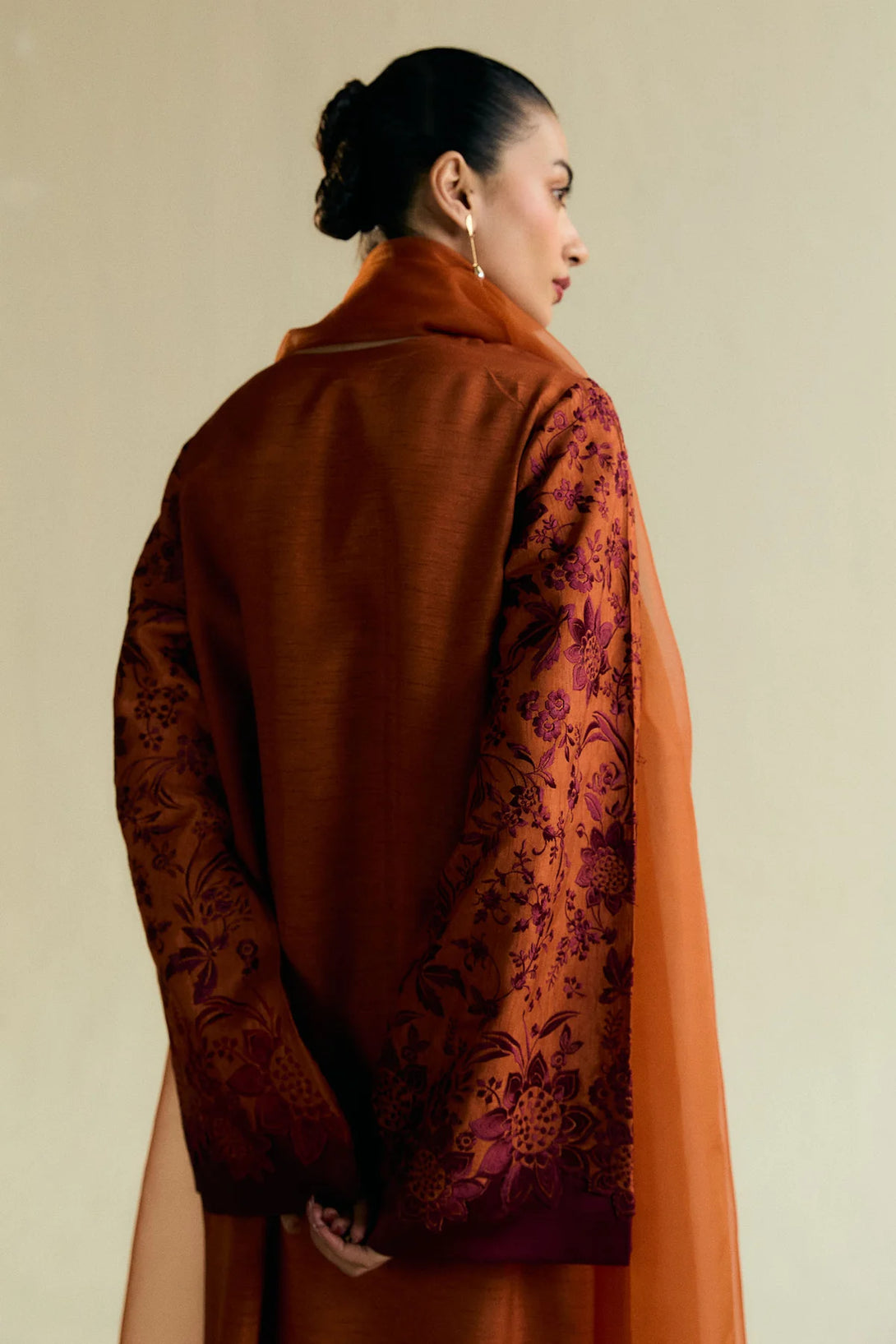 A rust outfit, featuring intricate embroidery with classic elements making it a choice for any occasion to radiate understated elegance.